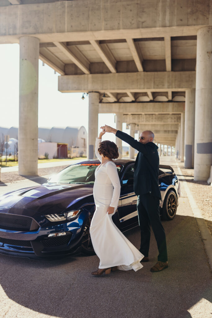 In the West Bottoms, they showed off their Mustang and gave us such cool, cinematic energy. And because they actually met through the ballroom dance world — and have known each other for years as friends — we definitely had them dance for us. Those candid dancing shots ended up being some of my favorites of the entire day. Their connection just glows.